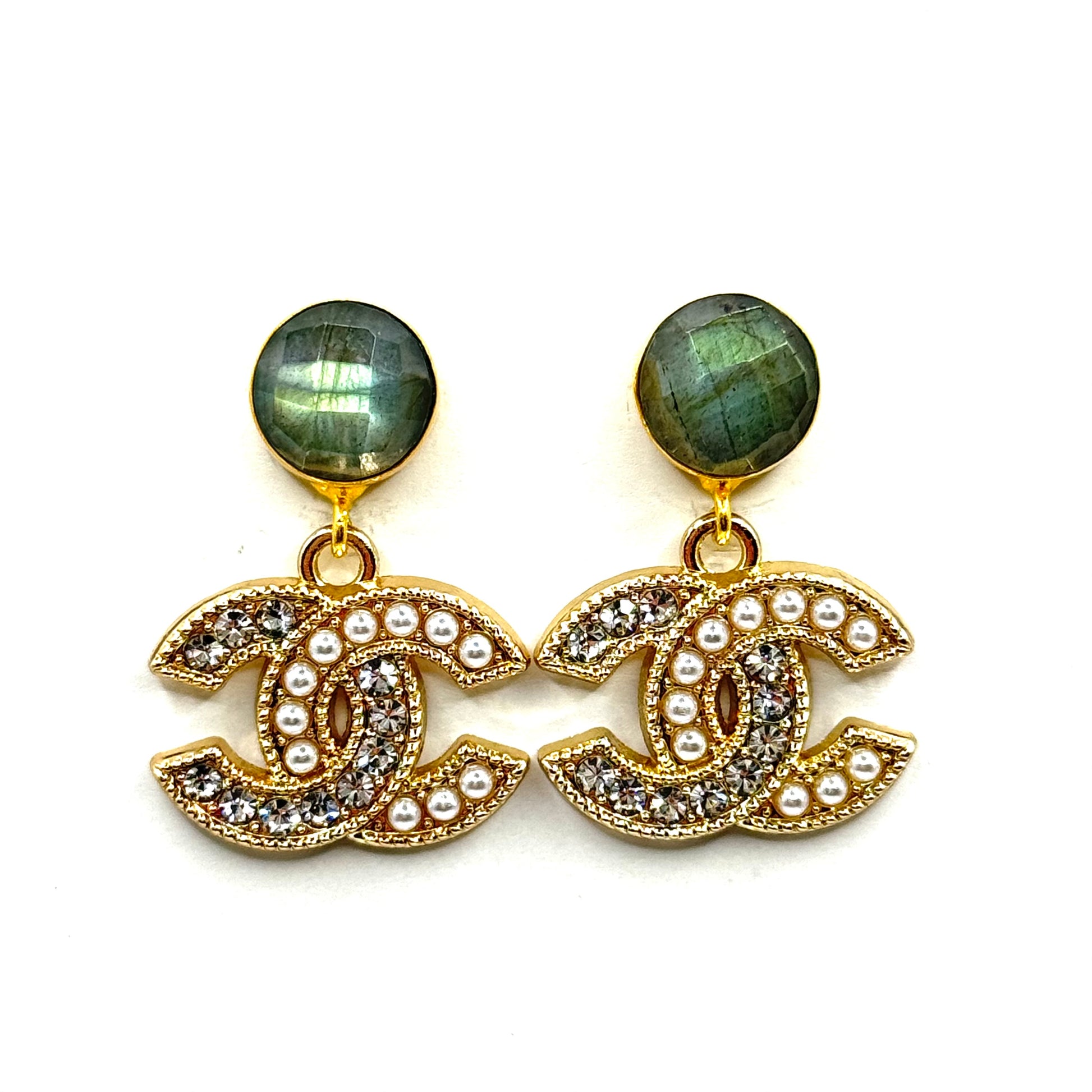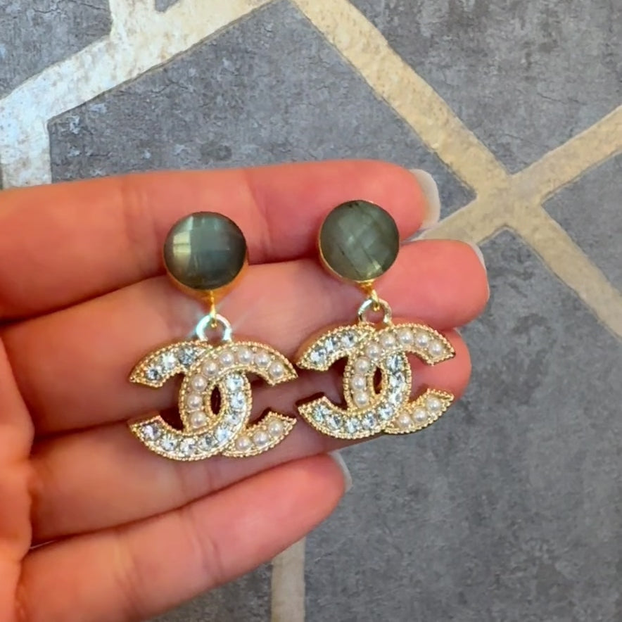 Sparkle, pearly and gold-toned earrings handmade from luxury upcycled zipper pulls. Featuring gold plated, iridescent earring posts. Drop is about 1 3/8 inches long.